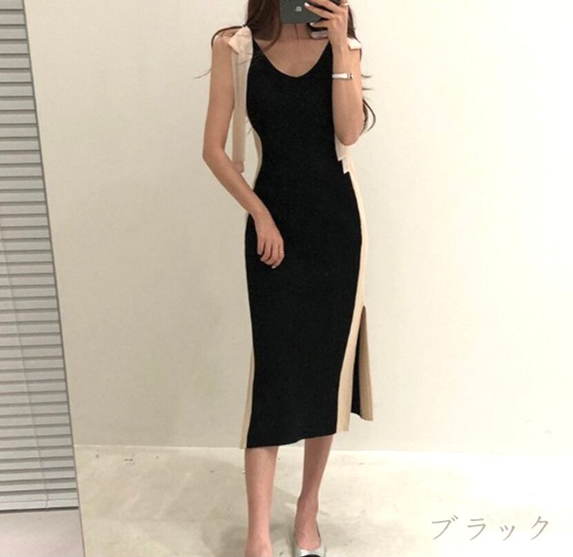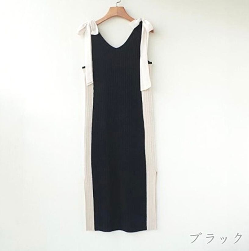 肩リボンスリットニットワンピース2色